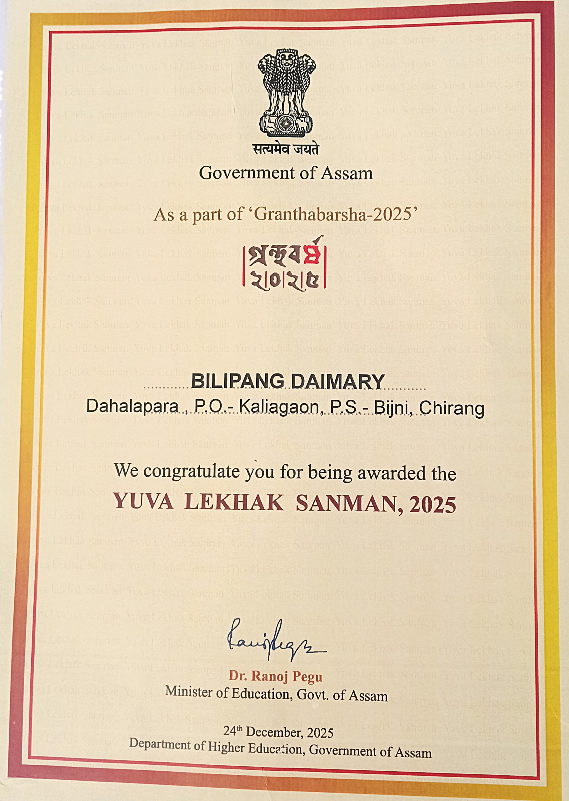 Birendra Giri Basumatary Best Discipline Award